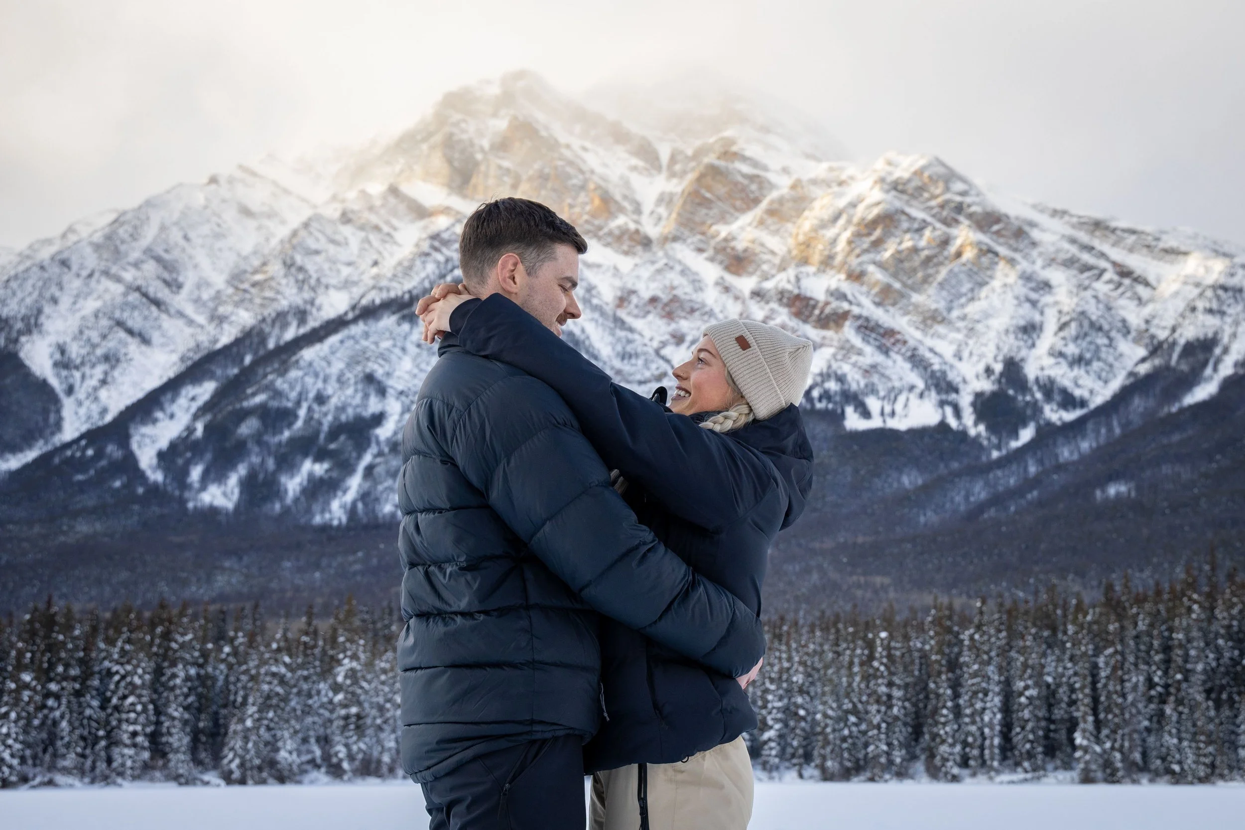 A proposal at Pyramid Lake in Jasper National Park