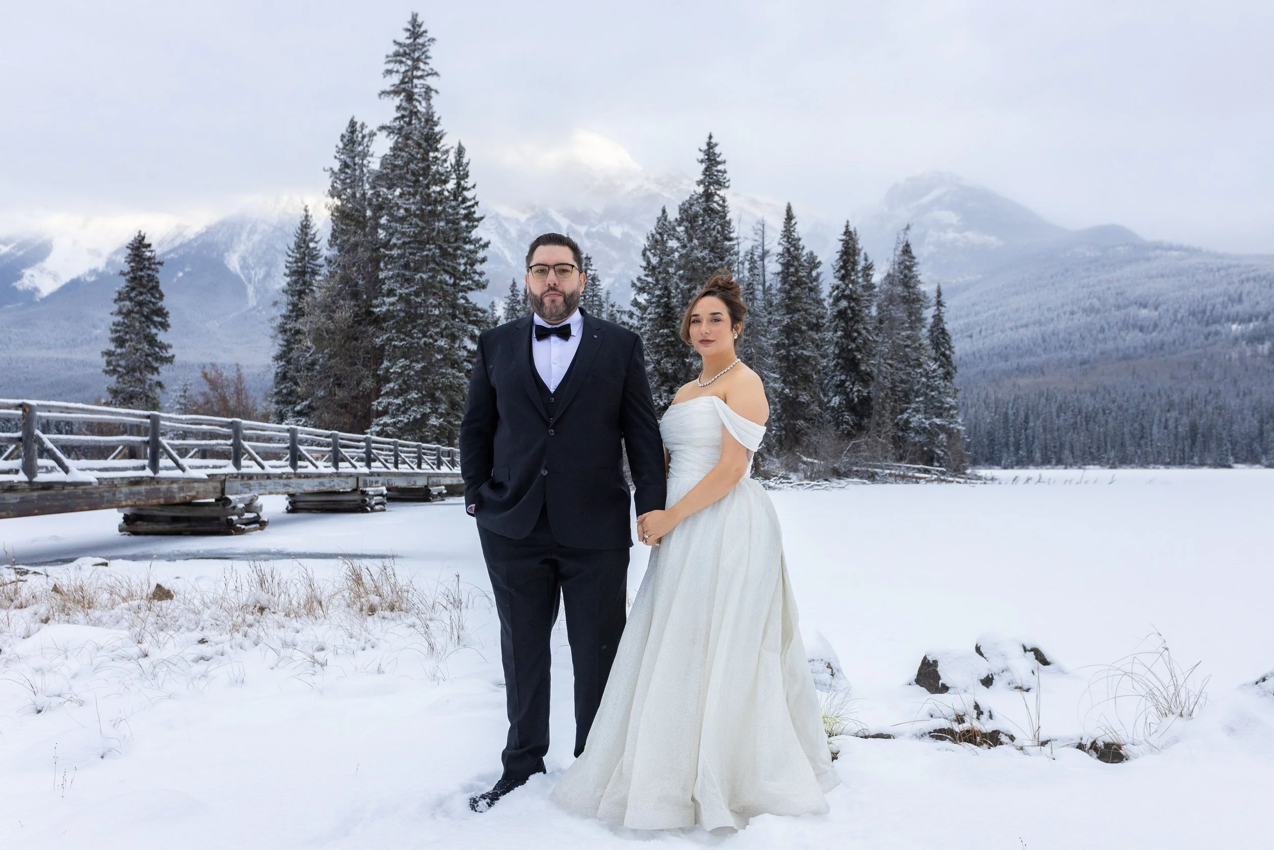 Fairmont Jasper Park Lodge: For couples who want comfort plus scenery, the lakeside grounds offer classic views, well-kept spaces, and easy logistics for guests. You can host a ceremony by the water, then slip away for portraits at golden hour. Great for larger weddings (although small weddings are lovely here too!), plus the venue offers planning assistance if needed. Winter wedding approved as well!